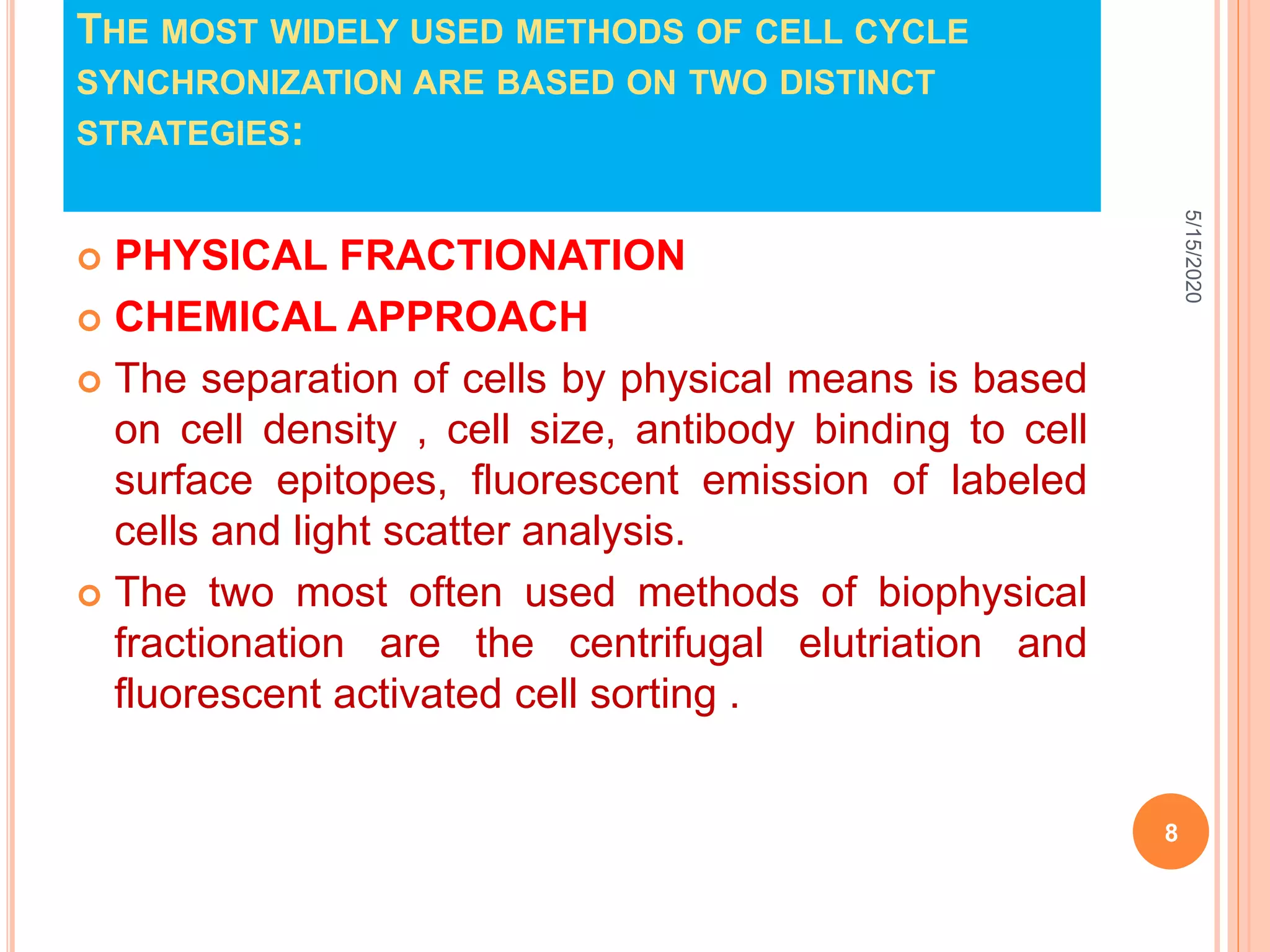 Cell synchronization Biology Diagrams The cells at different stages of the cell cycle in a culture can be synchronized so that the cells will be at the same phase. Cell synchrony is required to study the progression of cells through cell cycle. Several laboratory techniques have been developed to achieve cell synchronization. They are broadly categorized into two groups: 1. A synchronous or synchronized culture is a microbiological culture or a cell culture that contains cells that are all in the same growth stage. [1] [2]As numerous factors influence the cell cycle (some of them stochastic) normal cultures have cells in all stages of the cell cycle.Obtaining a culture with a unified cell-cycle stage is useful for biological research where a particular stage in Cell culture synchronization is technique used to bring cells in culture representing different stages of the cell cycle to the same phase. The most commonly used methods for cell culture synchronization include: Chemical blockade- this method exposes cells to chemicals that interfere or block certain cell cycle processes such as DNA replication.