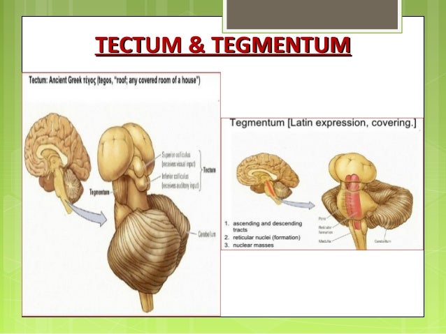 Tegmentum: This anterior surface of the midbrain contains numerous structures including the reticular formation, the periaqueductal gray (PAG) matter, certain cranial nerve nuclei, sensory and motor nerve pathways (the corticospinal and spinothalamic tract), the red nucleus, the substantia nigra, and the ventral tegmental area (VTA).; Tectum: The posterior surface of the midbrain contains the The midbrain or mesencephalon is the uppermost portion of the brainstem connecting the diencephalon and cerebrum with the pons. [2] It consists of the cerebral peduncles, tegmentum, and tectum.. It is functionally associated with vision, hearing, motor control, sleep and wakefulness, arousal (), and temperature regulation.[3]The name mesencephalon comes from the Greek mesos, "middle", and The brainstem, including the midbrain, the pons, and the medulla, comprises several nerves, pathways, reflex centers, and nuclei (see Image. Midbrain Anatomy). The midbrain is the smallest portion of the brainstem (about 1.5 cm) and its most cranial structure. It is in the brainstem between the pons caudally (mesencephalic-pons groove) and the diencephalon, which includes the thalamus, the